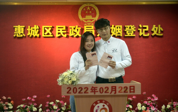 2022年2月22日,來到惠城區(qū)婚姻登記處登記的一對(duì)新人合照。