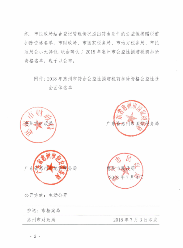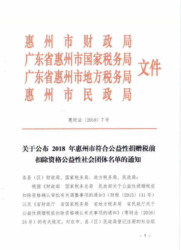 關于公布2018年惠州市符合公益性捐贈稅前扣除資格公益性社會團體名單的通知