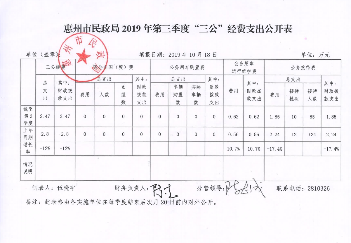惠州市民政局2019年第三季度“三公”經(jīng)費支出公開表