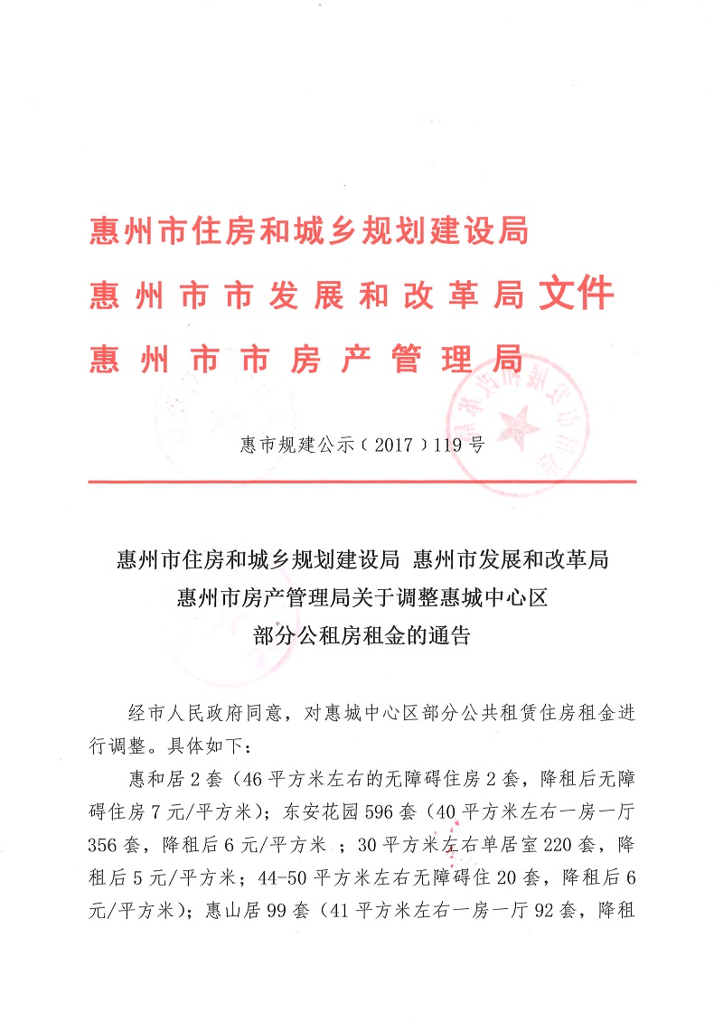 惠州市住房和城鄉規劃建設局、惠州市發展和改革局、惠州市房產管理局關于調整惠城中心部分公租房租金的通告
