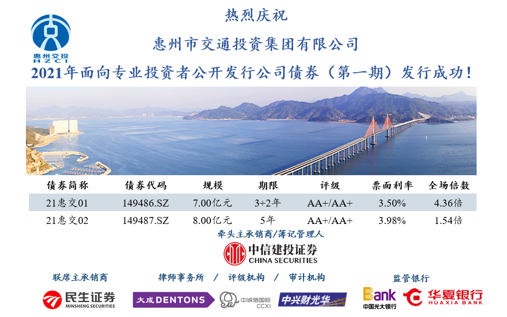 5月25日,惠州交投成功發(fā)行15億元公募公司債券,其中品種一發(fā)行期限3+2年、發(fā)行規(guī)模7億元、票面利率3.50%、認(rèn)購(gòu)倍數(shù)4.36倍;品種二發(fā)行期限5年、發(fā)行規(guī)模8億元、票面利率3.98%、認(rèn)購(gòu)倍數(shù)1.54倍。 本期債券作為惠州市國(guó)有企業(yè)首單公募公司債券亮相資本市場(chǎng),得到銀行、證券、基金等機(jī)構(gòu)投資者的廣泛歡迎及踴躍認(rèn)購(gòu),兩個(gè)品種同時(shí)創(chuàng)下2021年以來(lái)全市場(chǎng)公募債券同期限同評(píng)級(jí)最低利率水平,充分體現(xiàn)了市場(chǎng)投資者對(duì)惠州交投的高度認(rèn)可,同時(shí)反映出資本市場(chǎng)對(duì)惠州經(jīng)濟(jì)的發(fā)展充滿信心。 本期債券的成功發(fā)行,是惠州交投不斷創(chuàng)新融資模式邁出的重要一步,拓寬了在資本市場(chǎng)直接融資渠道,優(yōu)化了企業(yè)債務(wù)結(jié)構(gòu),降低了融資成本,實(shí)現(xiàn)了國(guó)有資產(chǎn)保值增值,促進(jìn)了惠州交投高質(zhì)量均衡可持續(xù)發(fā)展,為我市建設(shè)更加幸福國(guó)內(nèi)一流城市貢獻(xiàn)了國(guó)企力量。