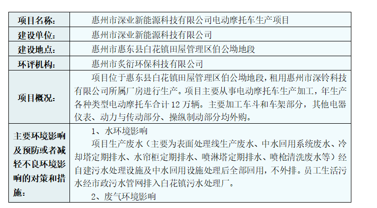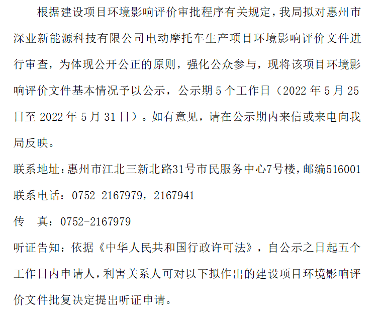 惠州市生態(tài)環(huán)境局?jǐn)M對惠州市深業(yè)新能源科技有限公司電動摩托車生產(chǎn)項目環(huán)境影響評價文件進(jìn)行審查的公示