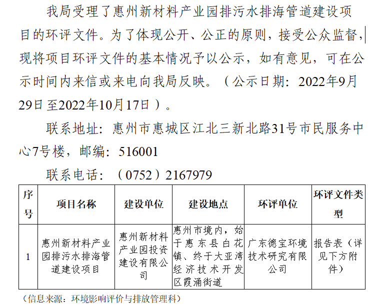 建設項目受理信息公示(惠州新材料產業園排污水排海管道建設項目)