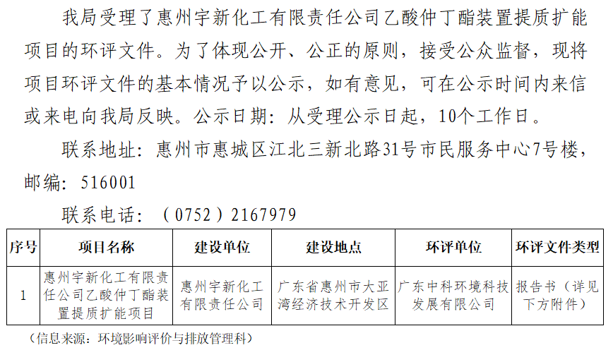 建設項目受理信息公示(惠州宇新化工有限責任公司乙酸仲丁酯裝置提質擴能項目)