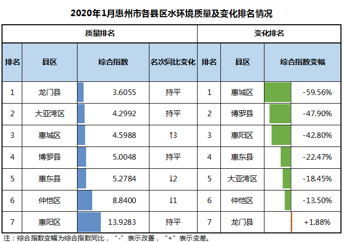 按照地表水環境質量考核斷面綜合指數排名,2020年1月,水環境質量由好到差依次排名為龍門縣、大亞灣區、惠城區、博羅縣、惠東縣、仲愷區、惠陽區。與2019年同期相比,惠城區、博羅縣、惠陽區、惠東縣、大亞灣區、仲愷區等6個縣區水環境質量有所改善,龍門縣有所變差。