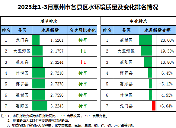 2023年1-3月惠州市水環境質量及變化排名情況