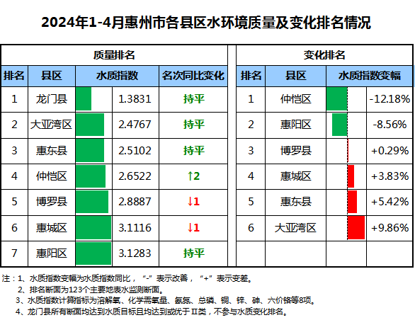 “十四五”國家地表水環(huán)境質(zhì)量監(jiān)測網(wǎng)的11個國控斷面水質(zhì)優(yōu)良率90.0%(10個),劣Ⅴ類比例為0%。 2024年1-4月,根據(jù)水質(zhì)指數(shù)排名,水環(huán)境質(zhì)量由好到差依次排名為龍門縣、大亞灣區(qū)、惠東縣、仲愷區(qū)、博羅縣、惠城區(qū)、惠陽區(qū)。與2023年同期相比,仲愷區(qū)、惠陽區(qū)2個縣區(qū)水環(huán)境質(zhì)量有所改善,博羅縣、惠城區(qū)、惠東縣、大亞灣區(qū)等4個縣區(qū)水環(huán)境質(zhì)量有所下降。