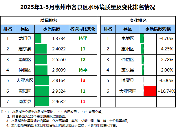 “十四五”國家地表水環(huán)境質(zhì)量監(jiān)測網(wǎng)的11個國控斷面水質(zhì)優(yōu)良率(Ⅰ-Ⅲ類)100%,劣Ⅴ類比例為0%。 縣區(qū)排名:2025年1-5月,根據(jù)水質(zhì)指數(shù)排名,水環(huán)境質(zhì)量由好到差依次排名為龍門縣、惠東縣、惠城區(qū)、仲愷區(qū)、大亞灣區(qū)、惠陽區(qū)、博羅縣。與2024年同期相比,惠城區(qū)、惠陽區(qū)、仲愷區(qū)、惠東縣、博羅縣等5個縣區(qū)水環(huán)境質(zhì)量有所改善,大亞灣區(qū)水環(huán)境質(zhì)量有所下降。