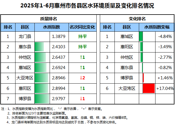 2025年1-6月惠州市水環(huán)境質(zhì)量及變化排名情況