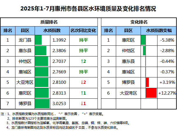 縣區排名:20251-7月,根據水質指數排名,水環境質量由好到差依次排名為龍門縣、惠東縣、仲愷區、惠城區、大亞灣區、惠陽區、博羅縣。與2024年同期相比,惠陽區、仲愷區、惠東縣、惠城區4個縣區水環境質量有所改善,大亞灣區博羅縣環境質量有所下降。
