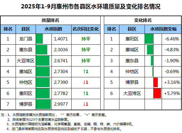 排名:20251-9月,根據水質指數排名,水環境質量由好到差依次排名為龍門縣、惠東縣、大亞灣區、惠城區、仲愷區、惠陽區、博羅縣。與2024年同期相比,惠陽區、惠城區惠東縣、仲愷區4個縣區水環境質量有所改善,大亞灣區博羅縣環境質量有所下降。