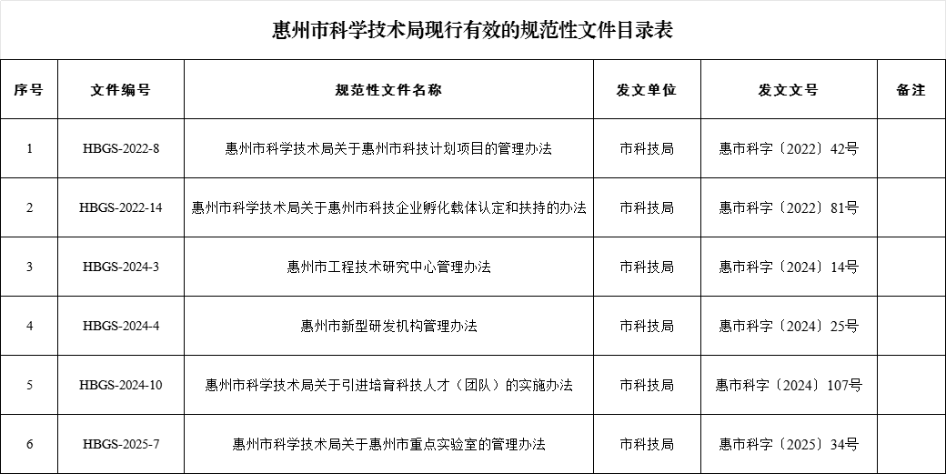 惠州市科學(xué)技術(shù)局現(xiàn)行有效的規(guī)范性文件目錄表