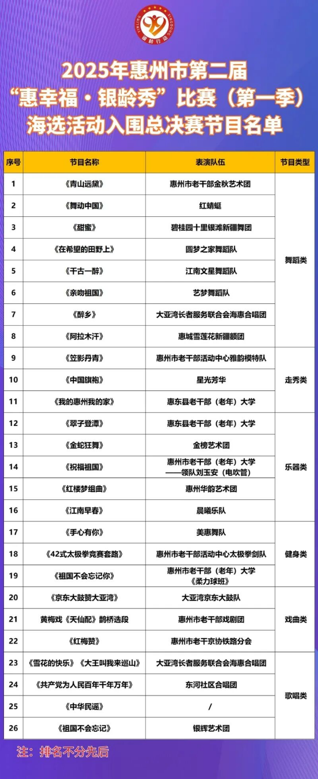 2025年惠州市第二屆“惠幸福?銀齡秀”比賽(第一季)海選活動于9月18日圓滿落幕。經專業評審現場打分,本季共有26個參賽節目脫穎而出,入圍年度總決賽。快來看看入圍名單吧!