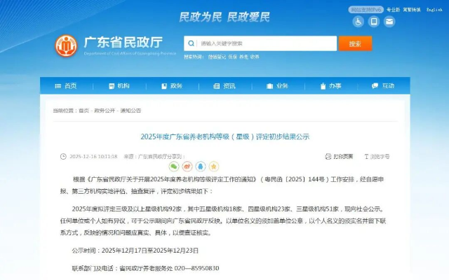 12月16日,省民政廳公示2025年度廣東省養老機構等級(星級)評定初步結果,惠州市再創佳績,共有8家機構獲評三星級及以上,其中,3家機構獲評五星級,占全省獲評五星級機構數量的六分之一,彰顯了惠州養老服務的過硬實力與持續進步。 近年來,惠州市始終將養老服務體系建設擺在民生工作的重要位置,著力構建分級分類、普惠可及、覆蓋城鄉、持續發展的養老服務體系。以養老機構星級評定為重要抓手,惠州市通過標準化建設、專業化提升、品質化管理,持續推動全市養老機構服務質量邁上新臺階,努力實現養老服務從“有”到“優”的跨越。 省養老機構星級評定工作每年集中開展一次,評定結果有效期為3年。我市堅持“以評促建、以評促改”,扎實推進縣級、鄉鎮養老機構等級評定工作。目前,處于有效期的星級養老機構共18家(含2025年新評定),占全市35家養老機構的51%,覆蓋城區與縣域,形成了梯度完整、結構合理的星級機構集群。其中五星級5家、四星級3家、三星級4家、二星級2家、一星級4家。 星級評定不僅是一張靜態的“成績單”,更是機構持續改進的“助推器”。今年,全市有三家機構實現星級躍升:一家由二星晉升三星,一家由三星直接躍升五星,另一家從四星提升至五星。 隨著“五星級養老機構突破5家”“三星級以上機構達12家”等成果的落地,星級評定已成為惠州養老服務高質量發展的強勁引擎。下來,惠州市將繼續以星級評定為引領,進一步完善養老服務標準體系,加強專業指導和動態監管,推動更多機構提質升級,切實滿足老年人多樣化、多層次、高品質的養老服務需求。 2025年度廣東省養老機構等級(星級)評定初步結果公示(僅展示惠州養老機構)