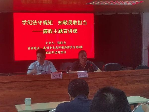 課上,張旺光結合博羅縣多個違紀違法案例,分析和梳理了違紀違法的原因以及特點特征,通過對典型案例的剖析,以案明紀、以案促廉,以身邊事教育身邊人。宣講的內容深入淺出,是一堂深刻的警示廉政教育課,讓參會黨員干部的思想政治意識受到了洗禮,敲響廉潔自律警鐘,進一步筑牢廉政思想防線。 最后蔡振宇在宣講會上作總結講話。他強調: 一要加強自警自律。 深刻警醒警覺,切實從違紀違法案例汲取深刻教訓,在環評審批、環境執法等敏感領域、重點環節、關鍵崗位上,筑牢思想防線,守住清正廉潔“底線”。 二要堅持依法行政。 著力提升我局執法人員學法、守法、用法的意識和能力,將重點領域、敏感案件的涉穩風險降到最低。 三要改善工作作風。 強化規矩意識,遵守局內紀律、嚴以律己。在處理群眾環境投訴、加快環評審批等為民辦實事上加大力度優化服務,打造新時代環保鐵軍形象。