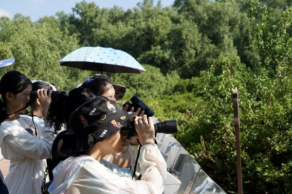 在美麗的紅樹林森林公園,同學們手持望遠鏡,在生態環境講解員的帶領下,沿著望鷺臺長廊,眺望流翠湖上覓食的鳥兒。清晨的紅樹林上空,鳥兒盤旋飛舞,趕著清晨朝陽覓食,呈現一幅生機盎然的景象,引得大家連連贊嘆。