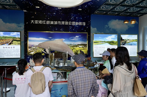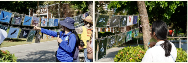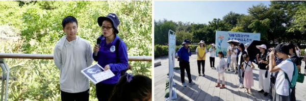 生態環境講解員為親子家庭示范望遠鏡的使用方法,引導同學們觀察鳥兒,并講解鳥兒的外貌特征、生活習性等知識。隨后,觀鳥團移步至紅樹林景區科普館,生態環境講解員一一介紹景區的環境知識,結合先前觀鳥的切實感受,同學們對理論知識有了深刻的領悟。
