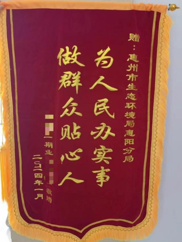 1月9日,惠州市生態環境局惠陽分局(以下稱“惠陽分局”)收到群眾贈送的一面“為人民辦實事,做群眾貼心人”的錦旗,以此表達對惠州市生態環境局惠陽分局工作的感謝和鼓勵。