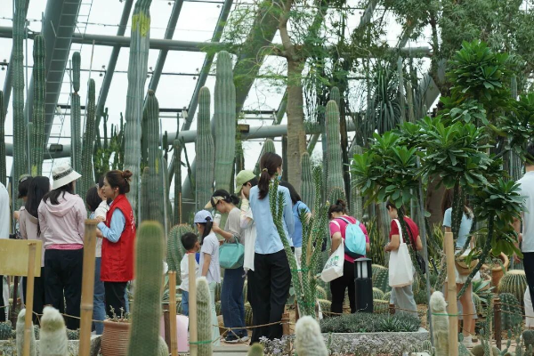 第二環節,小朋友們跟隨生態環境講解員和志愿者的腳步來到沙生館。實地觀察沙生植物“真面目”,講解員為家長和小朋友介紹了各種沙生植物名稱,小朋友對眼前那一棵棵形態不一,渾身長滿尖刺的植物表現出強烈的好奇心,甚至有些小朋友躍躍欲試地想上前觸摸,志愿者微笑著說“植物們很頑強也很脆弱,我們要小心呵護哦”。