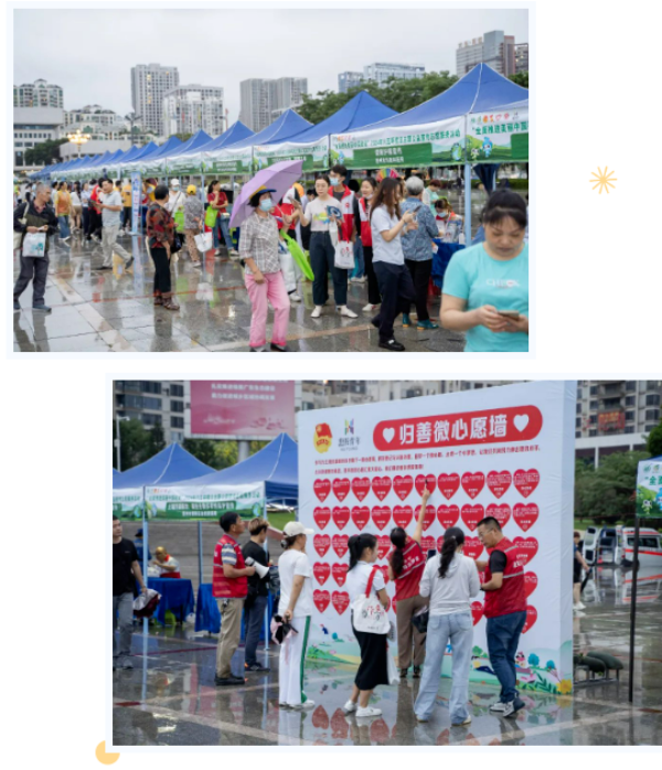 活動現場,相關單位及公益企業的志愿服務隊在廣場開展生態環境志愿服務,吸引了八百多名群眾前來參加。志愿者團隊以擺攤的形式為群眾提供義診、義剪、無償獻血等便民服務。其中,“微心愿”認捐攤位前人頭攢動,熱心群眾為50名困境青少年認捐小小心愿,幫助他們實現微小又純真的夢想。志愿者們用實際行動詮釋“奉獻、友愛、互助、進步”的志愿精神,為現場的群眾帶來一次舒心的活動體驗。