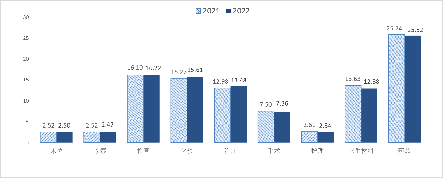 全市各級各類醫療衛生機構總支出中人員經費支出占比41.28%,比上年下降0.68個百分點;醫院人員經費支出占比39.32%,比上年提高了0.90個百分點。 (二)醫療費用 1.醫院門診和住院費用。2022年,全市醫院次均門診費用291.57元,較上年上漲0.11%;次均住院費用為11745.77元,較上年降低4.08%,其中:公立醫院次均門診、次均住院費用分別為277.31元、12037.14元,分別較上年上漲1.27%、-5.35%。  圖9