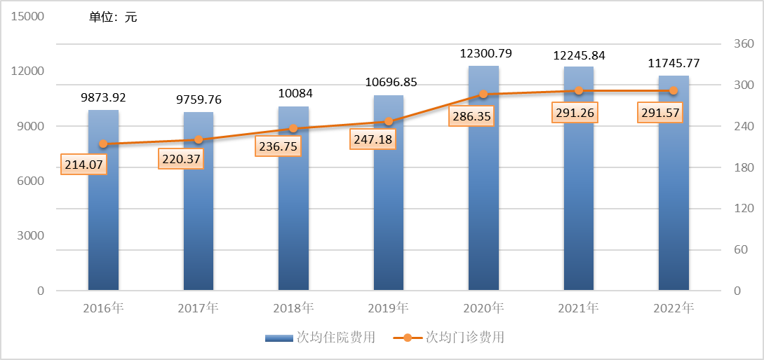 2016-2022年全市醫院次均門診和住院費用