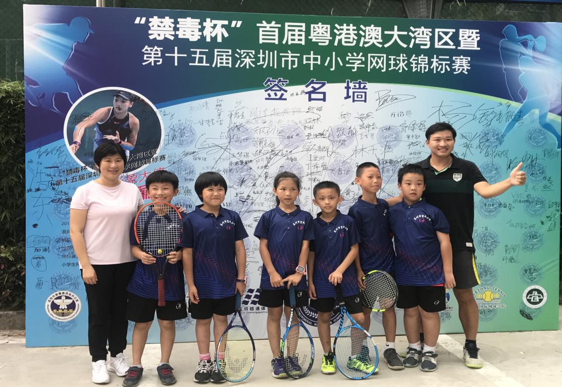 惠州市富民小學網球隊員與帶隊老師在簽名墻前合影