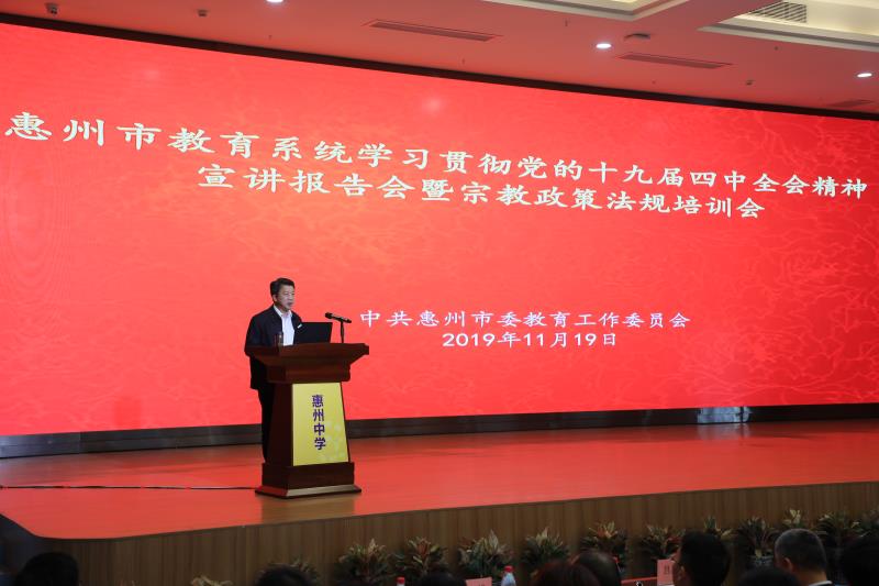 11月19日下午,市委教育工委在惠州中學舉辦全市教育系統學習貫徹黨的十九屆四中全會精神宣講報告會暨宗教政策法規培訓會,市委教育工委書記、市教育局黨組書記、局長袁清山同志主持會議并講話。