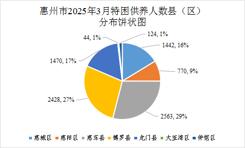 | 市縣區別 | 最低生活保障 | 特困供養 | | 戶數 | 人數 | 人數 | | 市合計 | 19046 | 48121 | 8841 | | 惠城區 | 2523 | 6166 | 1442 | | 惠陽區 | 1444 | 3218 | 770 | | 惠東縣 | 7883 | 20705 | 2563 | | 博羅縣 | 4142 | 9998 | 2428 | | 龍門縣 | 2667 | 7103 | 1470 | | 大亞灣區 | 193 | 450 | 44 | | 仲愷區 | 194 | 481 | 124 |