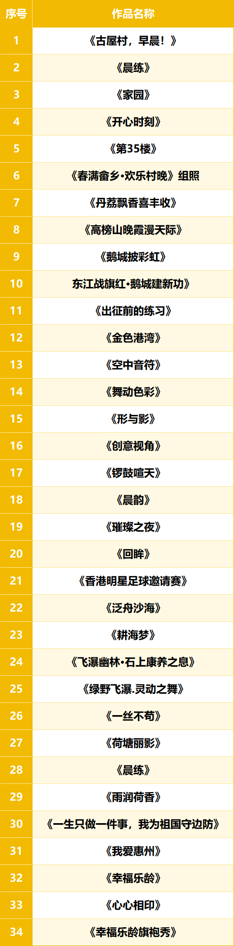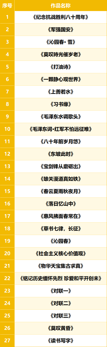 惠州市第二屆“惠幸福·銀齡秀”比賽(第二季)海選活動(書畫攝影)線上報名作品數量共199幅,涵蓋書法作品、繪畫作品、攝影作品三大類,經過專家評審,共有126幅作品入圍決賽,將在豐湖書院樂群堂展出?,F公布入圍作品名單和有關事項: