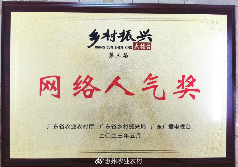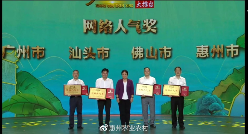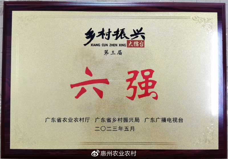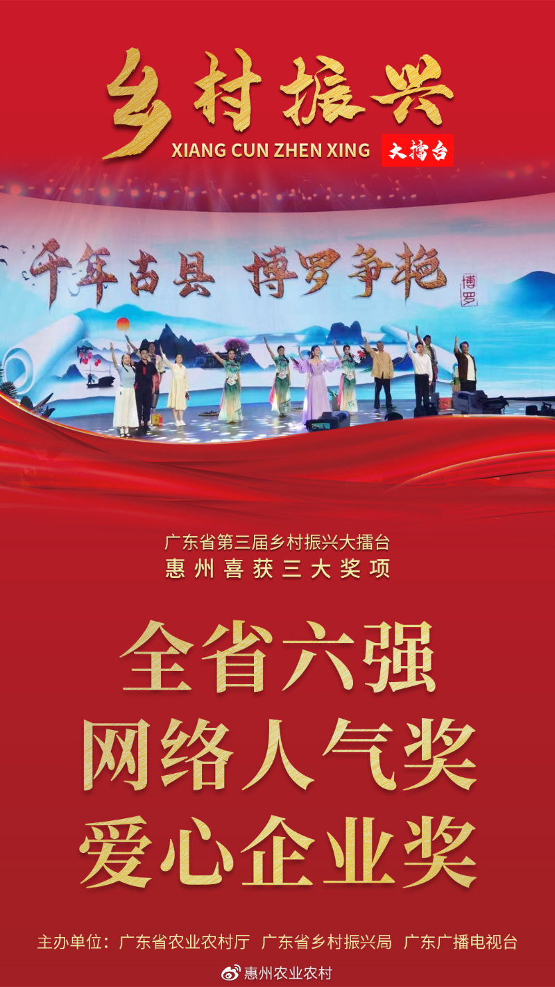 5月18日,廣東省第三屆“鄉村振興大擂臺”比賽頒獎晚會在廣州市舉行?;葜輵{借過硬實力和優異表現,榮獲“全省六強”“網絡人氣獎”“愛心企業獎”。 作為惠州市參賽代表的博羅縣,經過激烈角逐,最終以759.9分成功晉級全省六強。此外,惠州還獲得“網絡人氣獎”,泰康健康產業投資控股有限公司獲得“愛心企業獎”。 副市長黎炳盛代表惠州市上臺領取“全省六強”獎。惠州市委農辦主任,市農業農村局局長江遠波代表惠州市上臺領取“網絡人氣獎”。 “鄉村振興大擂臺”是一個地區近年來鄉村振興成效的濃縮。捧回的這些榮譽,既是對惠州當前鄉村振興工作成效的肯定,更是激勵全市繼續在鄉村振興道路上奮勇前行的力量?;葜輰⒁源俗鳛橥七M鄉村振興的新起點,深入學習貫徹習近平總書記關于全面推進鄉村振興的重要論述,全面落實省委關于實施“百縣千鎮萬村高質量發展工程”的決策部署,通過參擂打擂,帶動鄉村風貌顯著提升、示范帶動效應增強、短板弱項加快補齊、文化底蘊充分挖掘、干部共建熱情更好激發,推動全市鄉村振興再上新臺階。