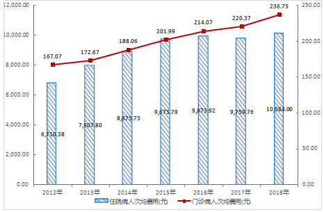1.醫院門診和住院費用。2018年,全市醫院次均門診費用、次均住院費用分別為236.70元、10084.00元,對比上年分別上漲7.40%和上漲3.32%。其中:公立醫院為227.50元、10451.22元,分別較上年上漲6.11%和上漲2.37%(見圖 9 、見表8)。