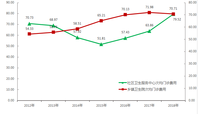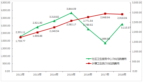 2.基層醫療機構門診和住院費用。2018年,社區衛生服務中心次均門診費用79.52元,較上年上漲24.44%;次均住院費用3110.37元,較上年上升66.63%。鄉鎮衛生院次均門診費用、次均住院費用分別為70.71元、2916.04元,較上年下降1.79%、1.11%(見圖 10 、表8)。