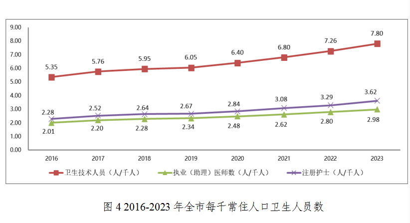 (三)在崗職工數。截至2023年底,全市醫療衛生機構在崗職工55215人,其中:衛生技術人員47378人、管理人員4355人(內:僅從事管理的人員1821人)、工勤技能人員4242、其他技術人員1774人。與上年相比,職工總量增加3133人,增長6.02%;衛生技術人員增加3432人,增長7.81%。