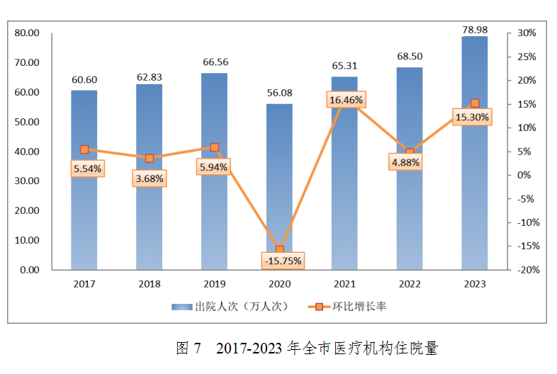 住院量:2023年,全市醫療機構出院78.98萬人次,其中:醫院64.18萬人次,衛生院6.07萬人次,婦幼保健院8.03萬人次,其他機構0.70萬人次。出院人次總量較上年增加15.30%。