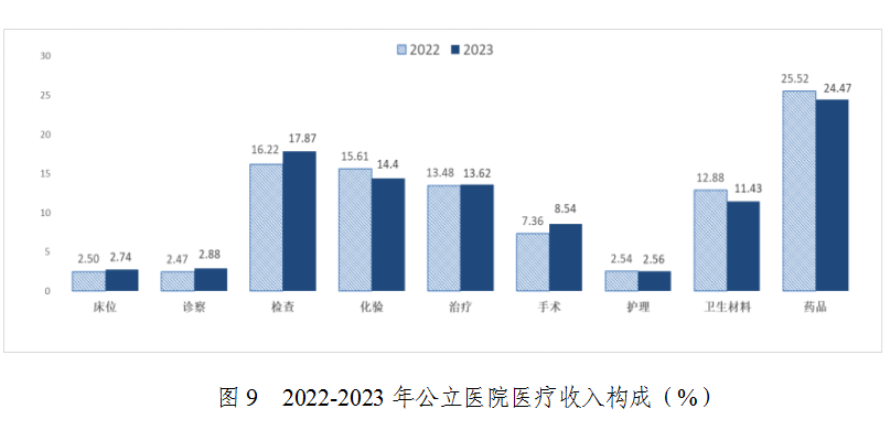 三、收支與費用 醫療收入總量增加,收支結構調整,住院費用下降。 (一)收入支出 2023年,全市醫療衛生機構財政撥款收入、醫療收入占總收入的比重分別為21.31%、73.55%,其中財政撥款收入占比較上年提高2.25個百分點,醫療收入占比較上年下降0.38個百分點。 公立醫院醫療收入中,藥品收入占比24.47%、耗材收入占比11.43%、檢查化驗收入占比32.27%,醫療服務收入占比31.83%,其中藥占比、耗材占比分別下降1.05、1.45個百分點,檢查化驗占比、醫療服務占比分別提高0.44、2.06個百分點。