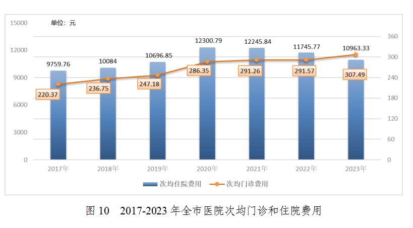 全市各級各類醫療衛生機構人員經費支出占43.20%,比上年增加1.92個百分點;公立醫院人員經費支出占42.4%,比上年提高2.48個百分點。 (二)醫療費用 1.醫院門診和住院費用。2023年,全市醫院次均門診費用307.49元,較上年上漲5.46%;次均住院費用10963.33元,較上年下降6.66%。其中:公立醫院次均門診、次均住院費用分別為288.99元、11162.62元,分別較上年上漲4.21%、-7.27%。
