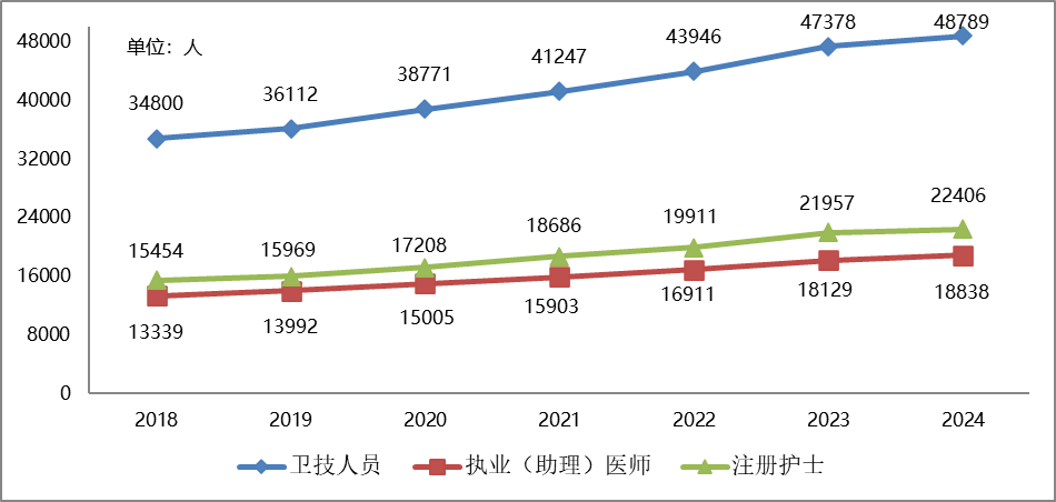 2018-2024年全市醫療機構床位數 (三)在崗職工數。截至2024年底,全市醫療衛生機構在崗職工56894人,其中:衛生技術人員48789人、管理人員4943人(內:僅從事管理的人員1951人)、工勤技能人員4357、其他人員1195人。與上年相比,職工總量增加1679人,增長3.04%;衛生技術人員增加1411人,增長2.98%。 按人員類別分:衛生技術人員中,執業(助理)醫師18838人,注冊護士22406人,分別較上年增加709人(增長3.91%)、449人(增長2.04%),醫護比1:1.19;技師(士)2901人(含:影像師574人、檢驗師1700人、康復師435人、其他技師(士)192人)。 按機構類別分:各類醫療衛生機構中,醫院在崗職工27677人(內:民營醫院7023人),較上年增長1.95%,基層醫療衛生機構24174人,較上年增長5.01%,專業公共衛生機構4960人,較上年減少0.70%。 按執業類別分:各類執業(助理)醫師中,臨床、中醫、口腔、公衛醫師分別為12492人、3356人、2508人、487人,占醫師比重分別為66.31%、17.82%、13.31%、2.59%。 按執業范圍統計,全市全科醫師共2807人(其中注冊為全科醫師專業的2614人、鄉村全科執業助理醫師數193人)。另有315人執業(助理)醫師取得全科醫生培訓合格證書。