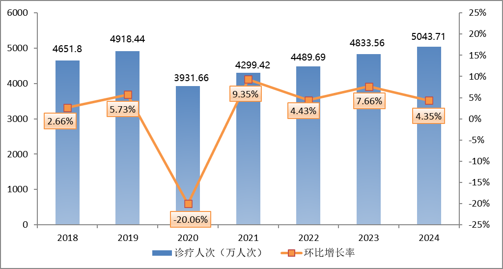 二、醫療服務 醫療機構門診、住院量增加,互聯網診療量增長,基層診療人次占比提高。 (一)醫療服務量 診療量:2024年,全市醫療衛生機構總診療人次達5043.71萬人次,其中:醫院1851.62萬人次,基層醫療機構2870.01萬人次(內:衛生院746.16萬人次,社區衛生服務機構501.37萬人次,村衛生室416.75萬人次,門診部(所)1205.73萬人次),專業公共衛生機構322.08萬人次。與上年相比,醫療機構總診療人次增加4.35%。