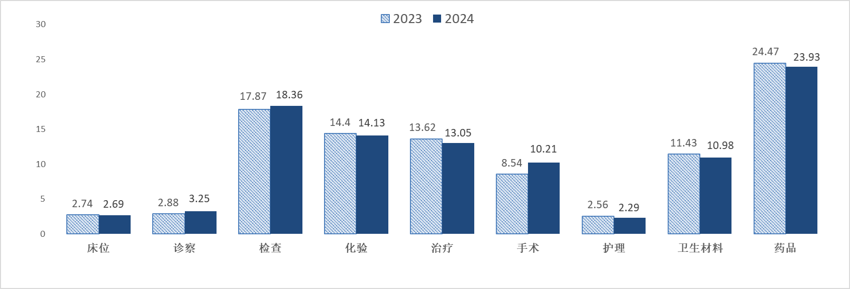 全市醫療衛生機構人員經費支出占比45.18%,較上年提高1.98個百分點。其中公立醫院人員經費支出占42.93%,較上年提高0.53個百分點。 (二)醫療費用 1.醫院門診和住院費用。2024年,全市醫院次均門診費用、次均住院費用分別為309.8元、10629.4元,分別較上年上漲0.75%和降低3.05%,其中:公立醫院次均門診290.6元,同比上漲0.55%,次均住院費用10781.5元,同比下降3.41%。
