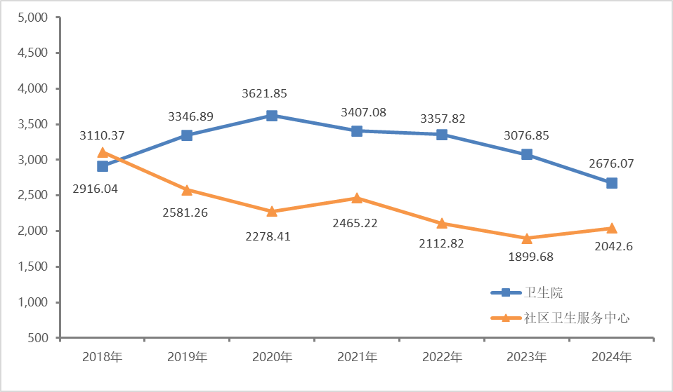 2.基層醫療機構門診和住院費用。基層醫療機構中,社區衛生服務中心次均門診費用117.6元,較上年下降15.21%;次均住院費用2042.6元,較上年上漲7.52%。衛生院次均門診費用、次均住院費用分別為87.3元、2676.1元,分別較上年下降7.99%、13.03%。