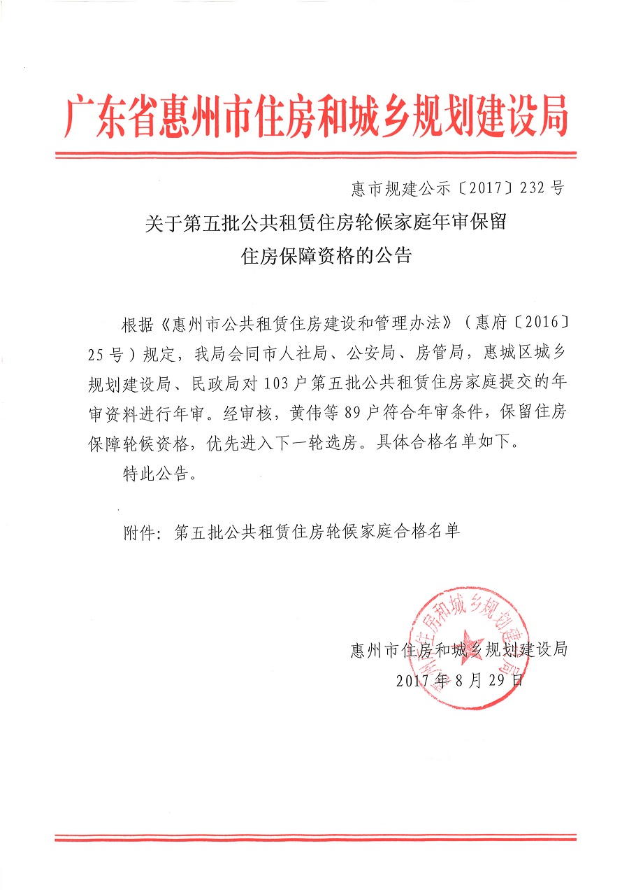 關(guān)于第五批公共租賃住房輪候家庭年審保留住房保障資格的公告(惠市規(guī)建公示〔2017〕232號)