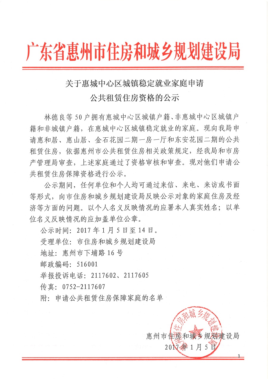 關于惠城中心區城鎮穩定就業家庭申請公共租賃住房資格的公示