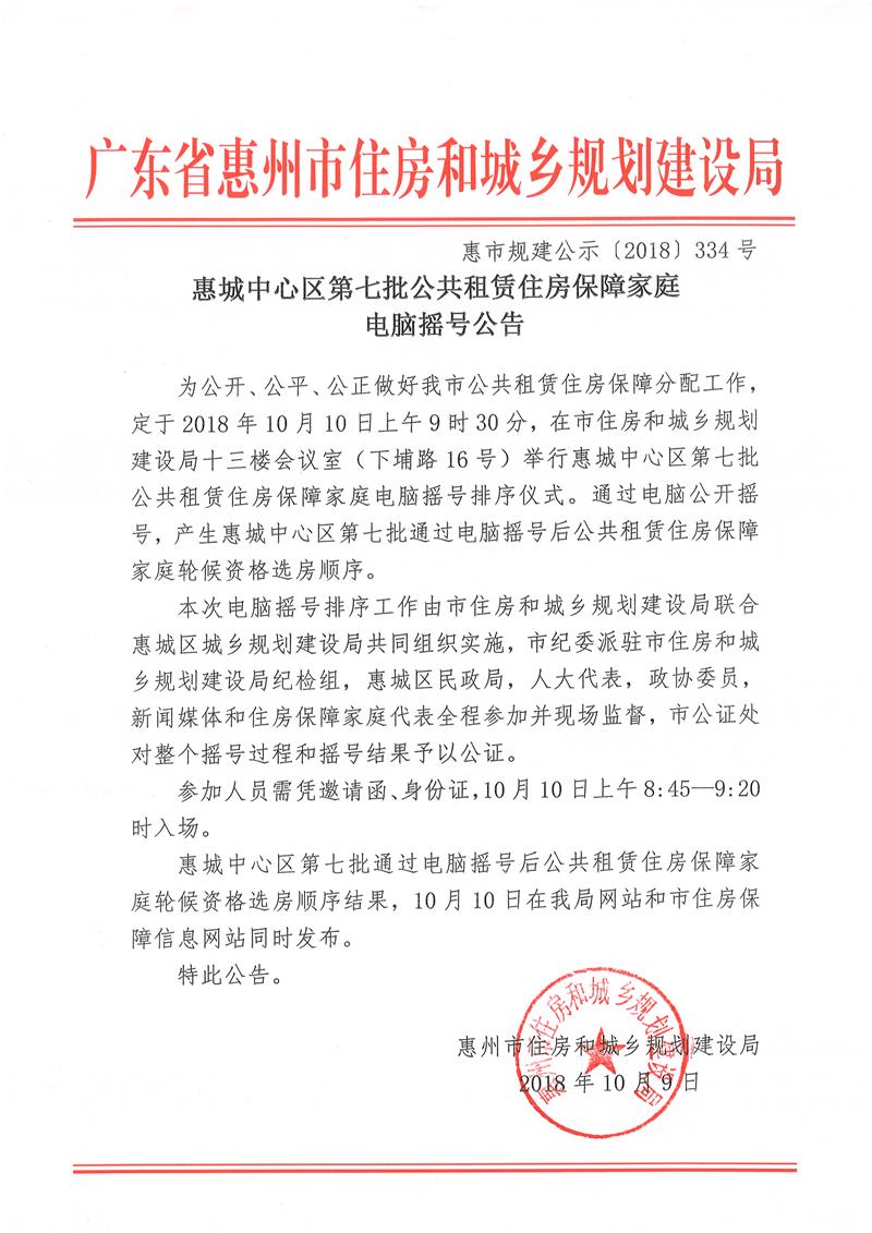 惠城中心區第七批公共租賃住房保障家庭電腦搖號公告