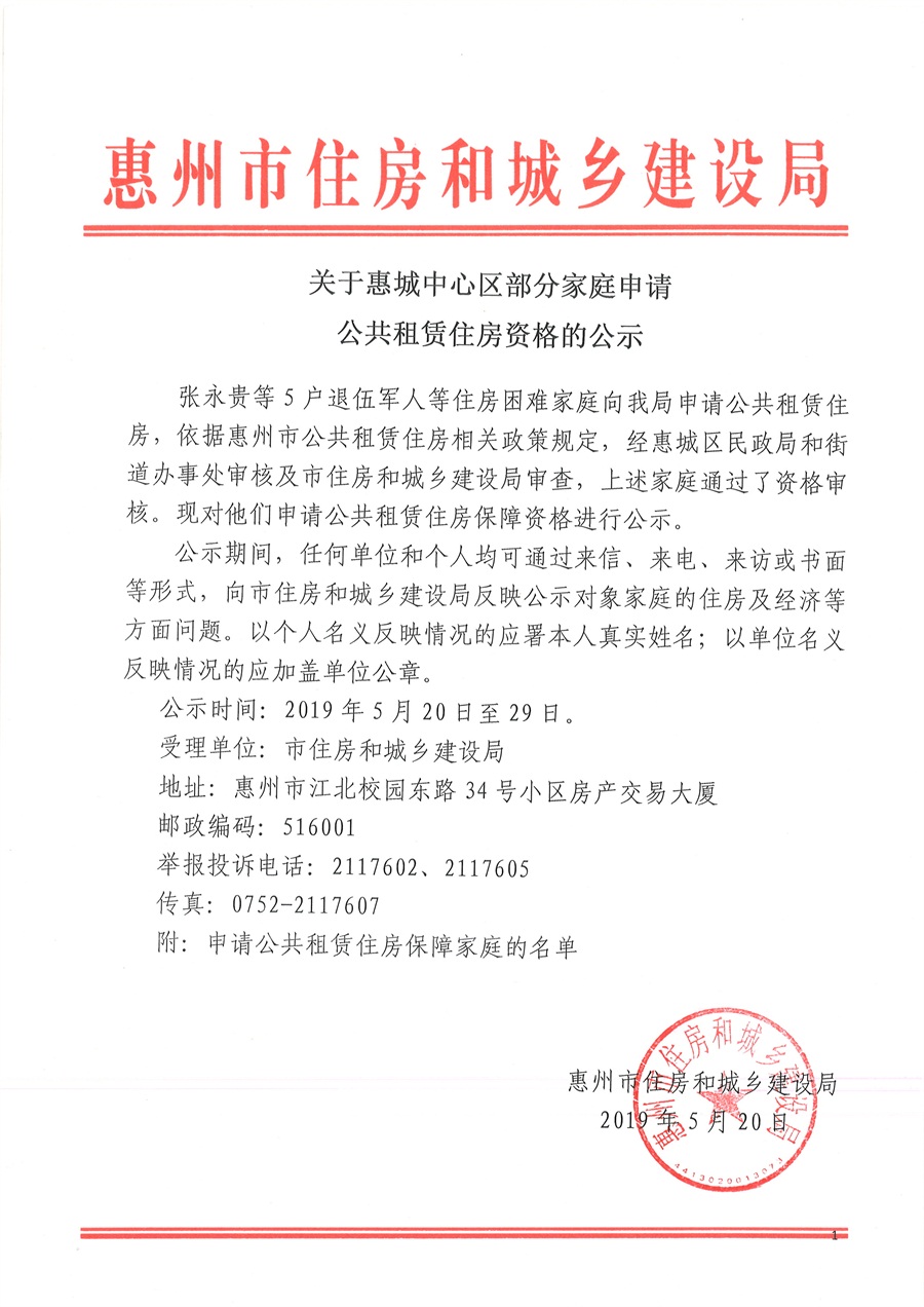 關于惠城中心區部分家庭申請公共租賃住房資格的公示
