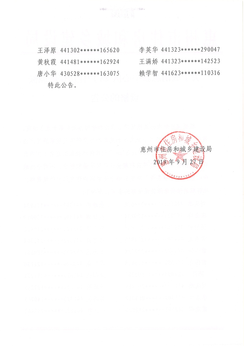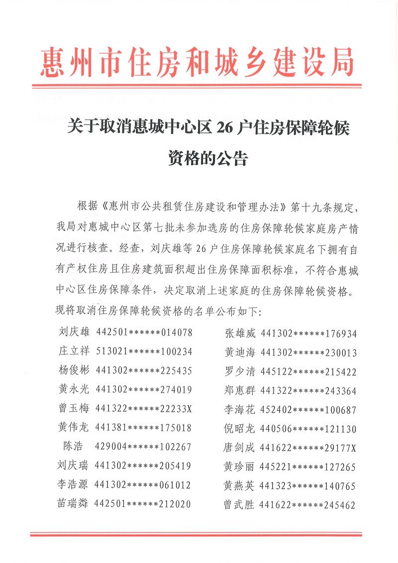 關于取消惠城中心區26戶住房保障輪候資格的公告