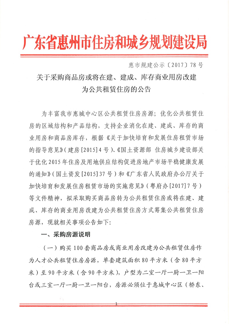 關于采購商品房或將在建、建成、庫存商業用房改建為公共租賃住房的公告 (惠市規建公示〔2017〕78號)