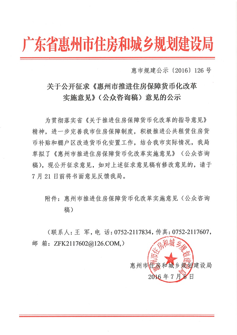 關于公開征求《惠州市推進住房保障貨幣化改革實施意見》(公眾咨詢稿)意見的公示