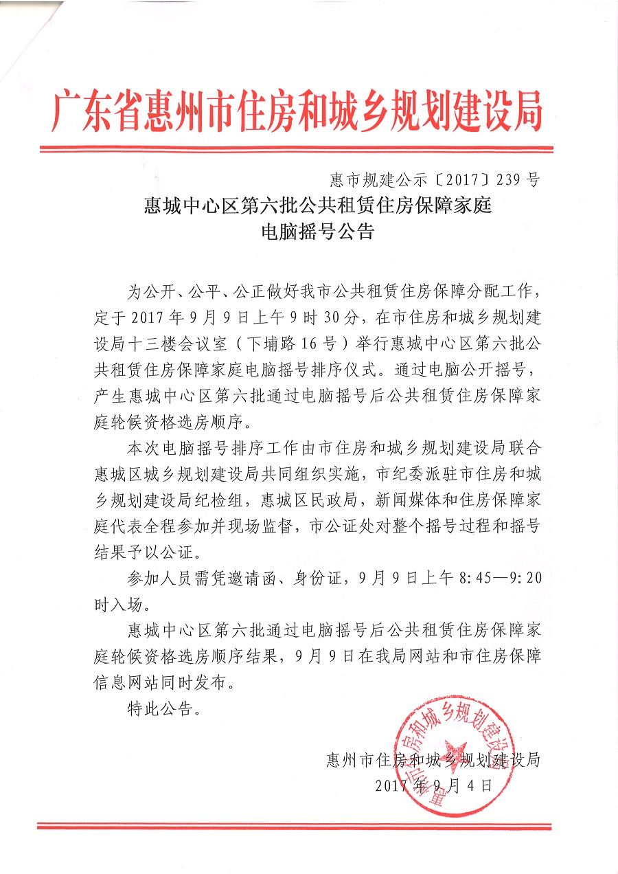 惠城中心區(qū)第六批公共租賃住房保障家庭電腦搖號公告(惠市規(guī)建公示[2017]239號)
