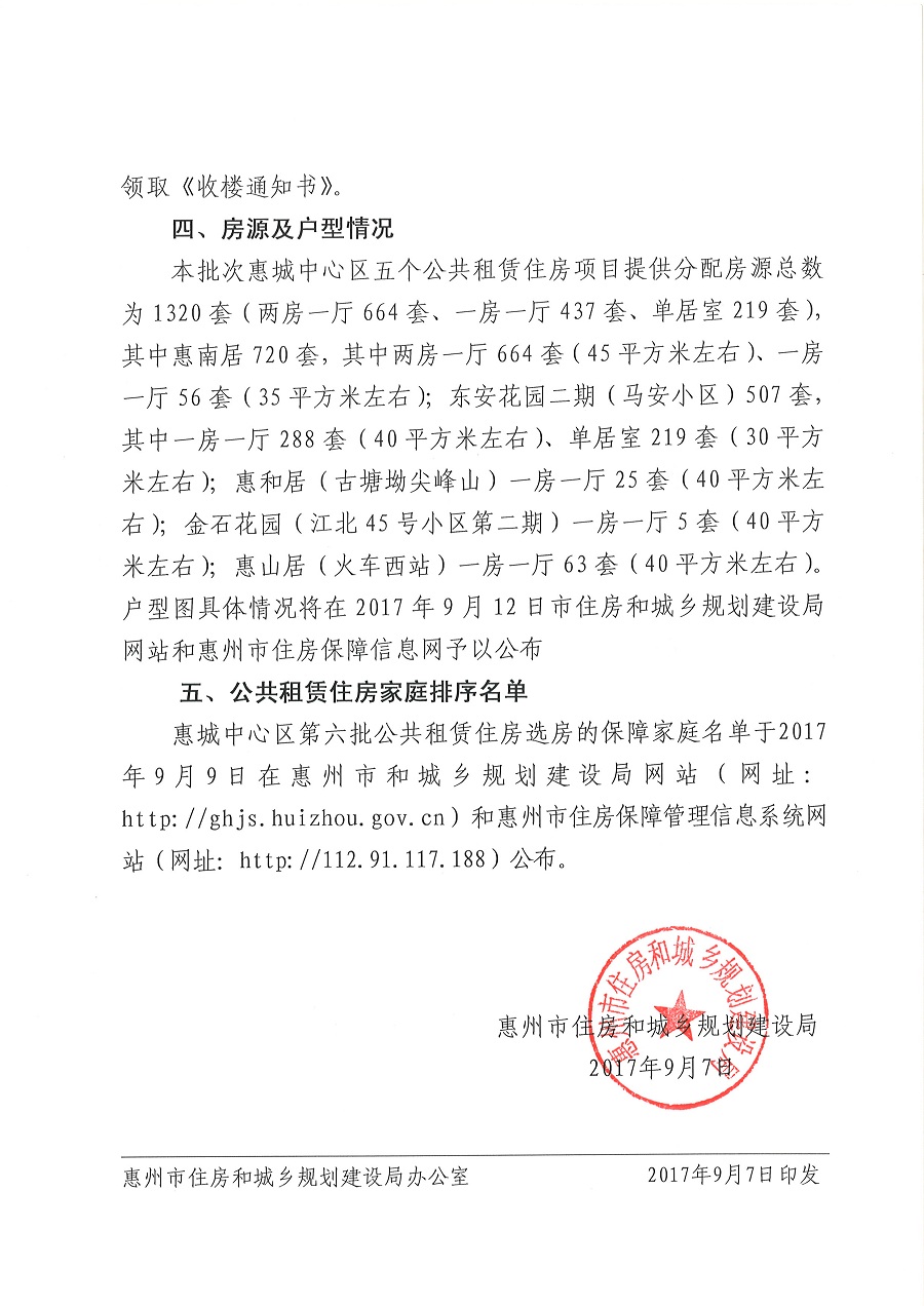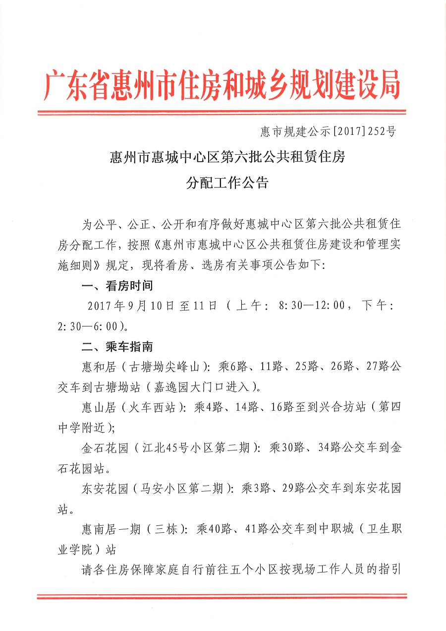 惠州市惠城中心區(qū)第六批公共租賃住房分配工作公告(惠市規(guī)建公示[2017]252號)